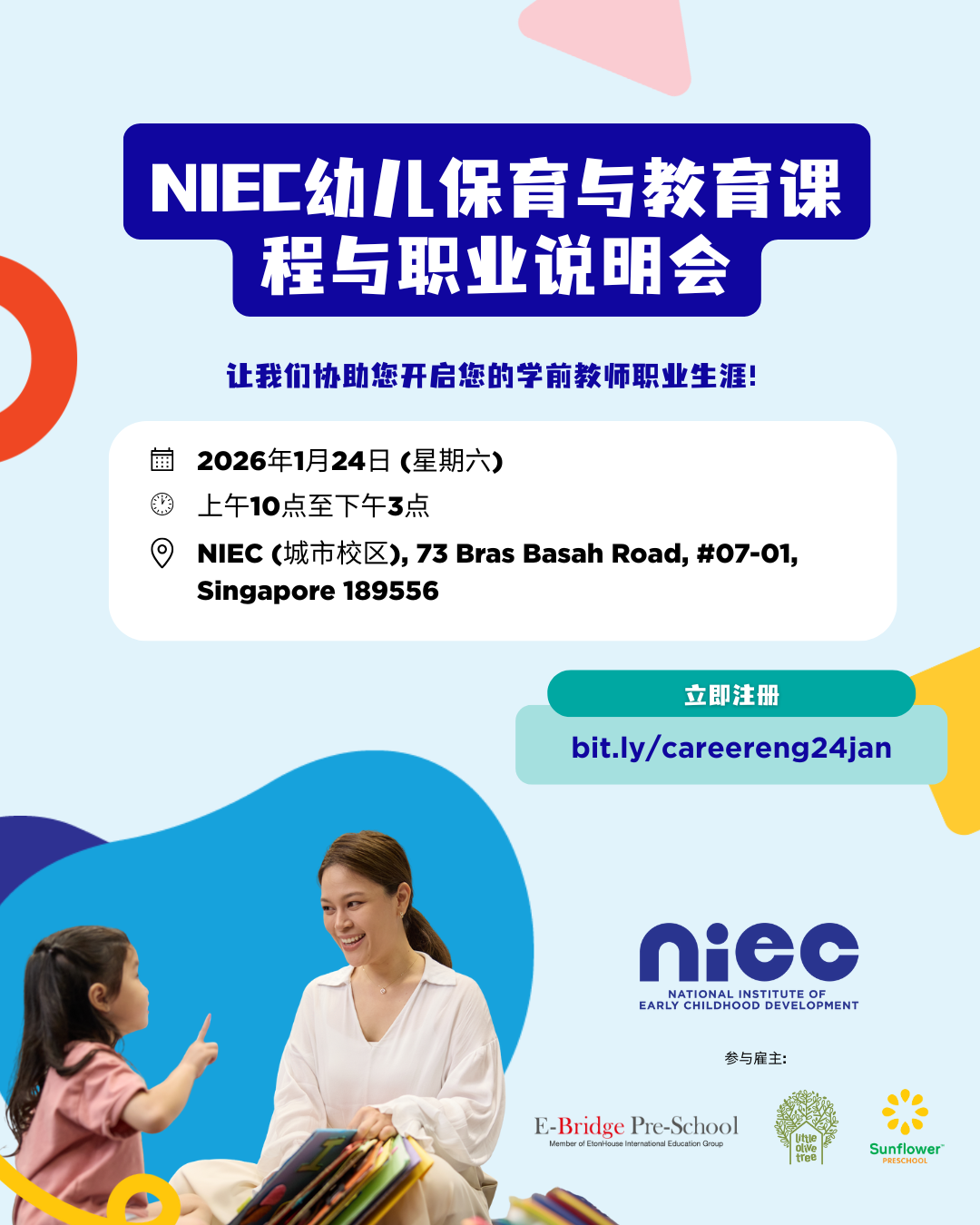 想从事意义非凡的学前教师工作并想了解课程详情吗?😊🧸 欢迎您参与我们的幼儿保育与教育课程与职业说明会, 让我们协助您开启您的学前教师职业生! 您将能了解幼教课程的入学要求、学费和各种资助管道,现场工作面试机会与更多 💪🏻