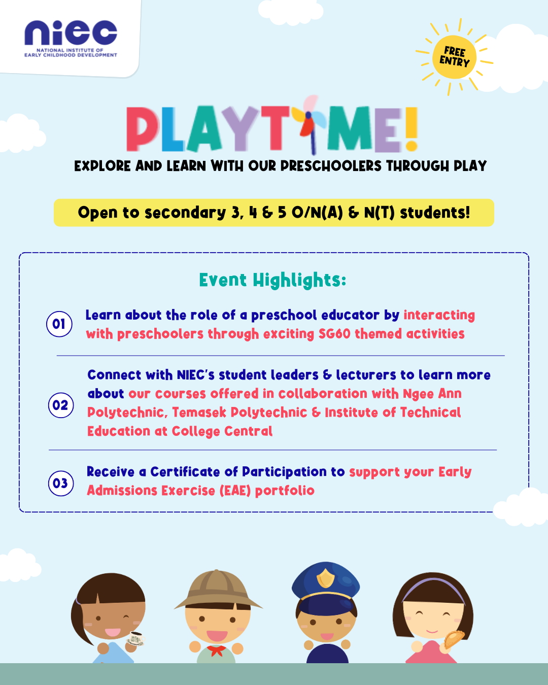 If you have a strong passion and aptitude for the early childhood sector, scroll down to learn how you can apply for NIEC’s courses through EAE!